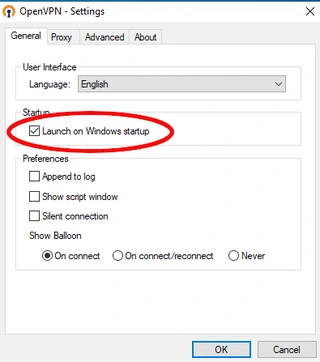 Go to OpenVPN’s Settings and check the box to launch the program on Windows startup.