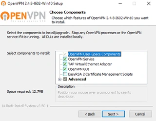 The installer is easy to use. Simply click Next when it first opens, then click I Agree to accept the license. You will then be asked to select which components to install. Leave the default boxes checked (OpenVPN Userspace, OpenVPN Service, TAP Virtual Ethernet Driver, and the OpenVPN GUI), then click Next again.