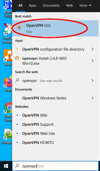 Begin typing “OpenVPN” in the Start Menu, and you will see the OpenVPN GUI program appear.