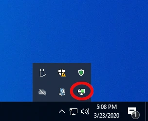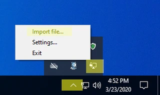 To open the program, we need to find the OpenVPN icon in the system tray. The system tray is the set of icons that appears at the bottom right in Windows, right beside the clock. Find the icon that looks like a small computer screen with a padlock on it. You might need to click the small up arrow by the clock to reveal the icon. Right-click the icon, then click Import File.