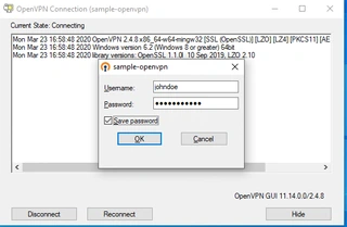 You will be presented with a window where you can enter your OpenVPN username and password. Again, your network administrator or VPN provider can supply you with this information. If you’d like, you can check the box to save your password to avoid having to type it each time.